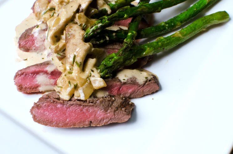 Whiskey rosemary cream sauce over deer steak and mushrooms